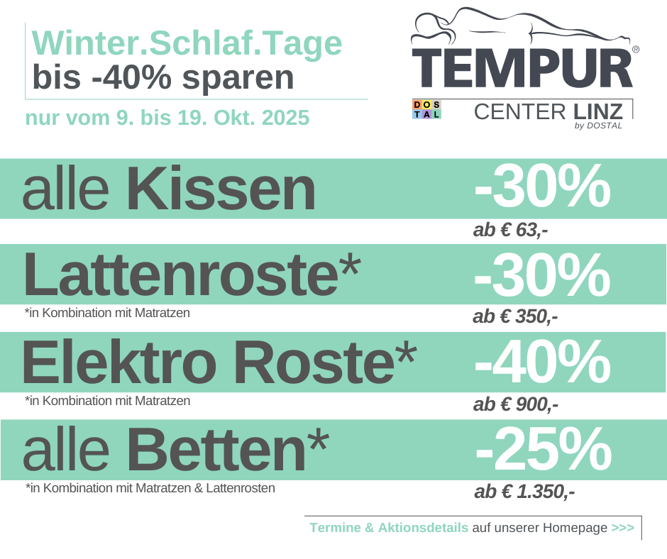 Neben den Aktionen auf der TEMPUR Homepage bieten wir Ihnen als TEMPUR Center Linz permanent das beste Angebot!